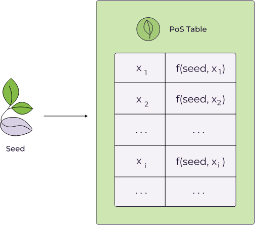 In short, the PoS plotter generates a table of permuted outputs from a set of random functions. The table size is determined by a memory bandwidth requirement parameter *k* set to 20, and the random functions are determined by a *seed*. When challenged at an *index*, the table outputs a short *proof-of-space* that can be efficiently verified. We do not use the proof-of-space directly to verify that a farmer has pledged a certain amount of space, as Chia does. Instead, we use it to prove that a farmer utilized the required memory bandwidth for encoding the plot.